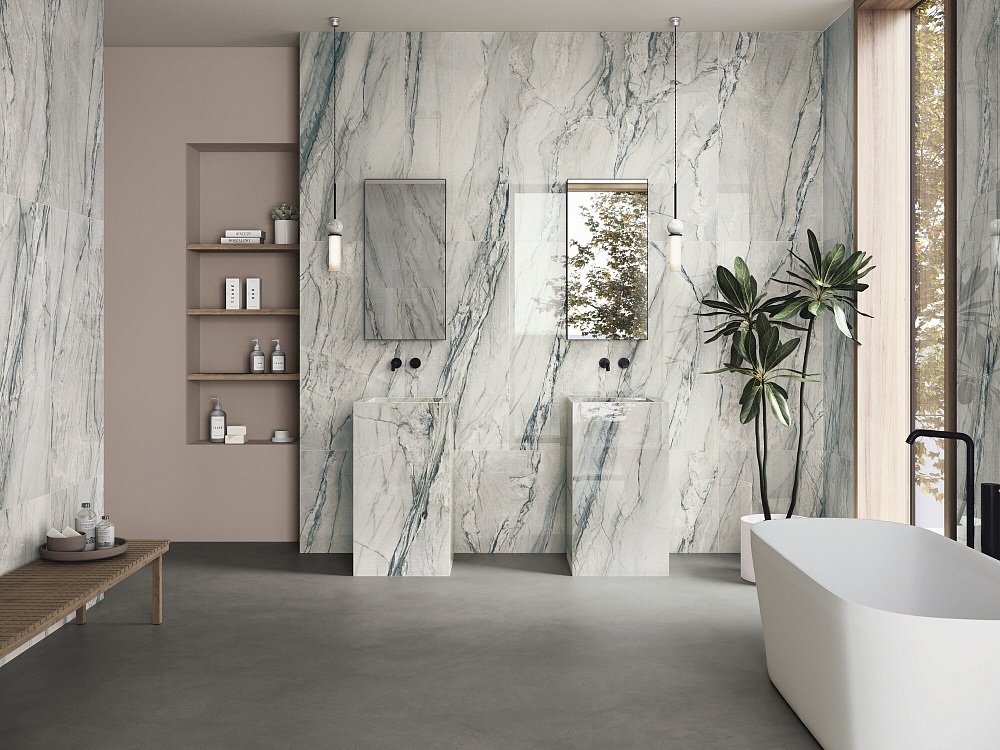 Элементы коллекции Michelangelo имеют два вида поверхности – матовую и полированную – и предлагаются в одном формате: 60×120 см, который имеет фактуру мрамора. Керамогранит из коллекции Michelangelo может быть использован для ванной, для гостиной, для коридора, для кухни, для пола и для стен.
