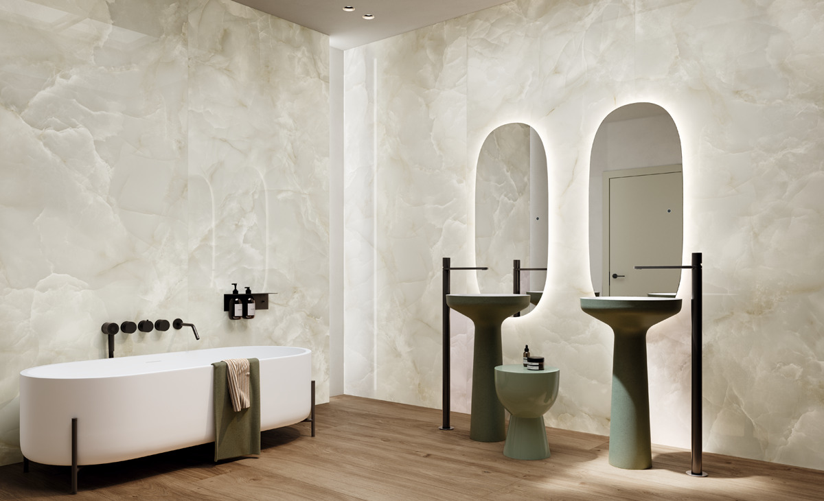 Элементы коллекции Onyx имеют один вид поверхности – полированную – и предлагаются в одном формате: 60×120 см, который имеет фактуру оникса и мрамора. Керамогранит из коллекции Onyx может быть использован для ванной, для гостиной, для коридора, для кухни, для пола и для стен.
