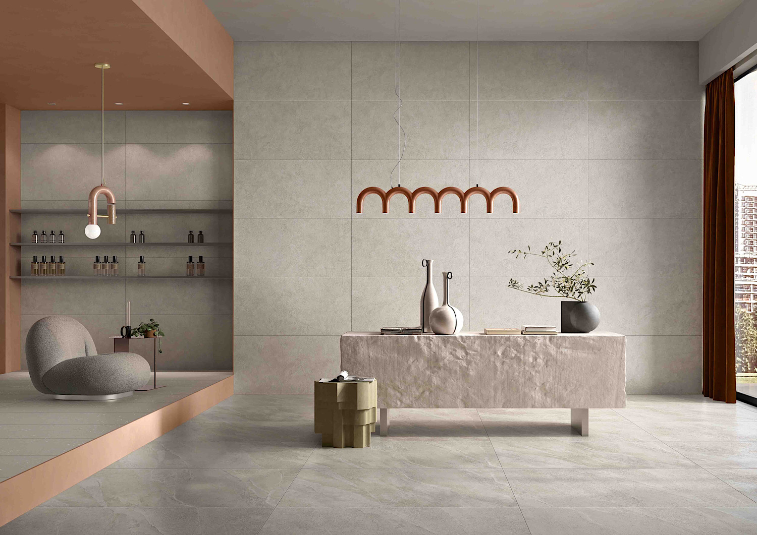 Элементы коллекции SandBark имеют один вид поверхности – матовую – и предлагаются в одном формате: 60×120 см, который имеет фактуру камня и бетона. Керамогранит из коллекции SandBark может быть использован для ванной, для гостиной, для коридора, для кухни, для пола, для стен и для улицы.